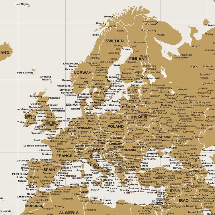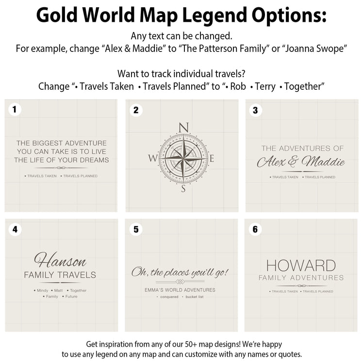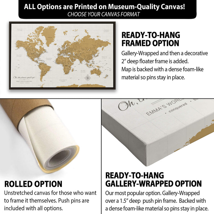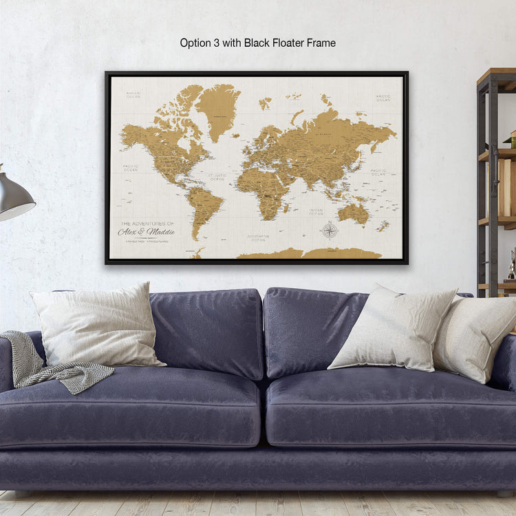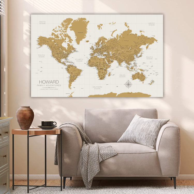 Track your travels on this pinnable world map in beautiful gold and cream. World map with pins is perfect for reminiscing about past adventures and planning new ones. Map can be customized with names and quotes to create a truly one-of-a-kind keepsake. Legend options can be personalized to track individual or family travels. Swipe through additional photos to see personalization options & close-up details.
