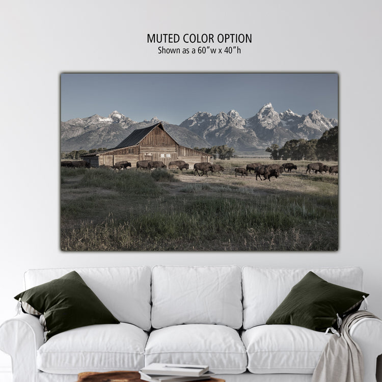 Spectacular Grand Teton National Park Photo with Buffalo Roaming the landscape is a rare photo moment. Famous Moulton Barn in Jackson Hole Wyoming brings your walls to life with the Grand Teton Mountains as a backdrop. Perfect for your western or farmhouse decor. Various sizes available including extra large size of 94" wide.