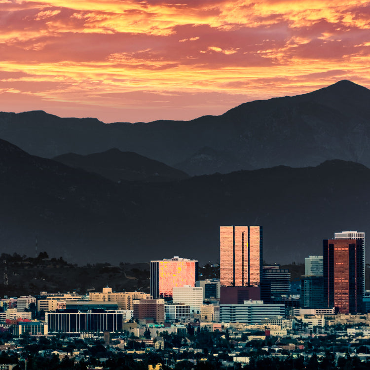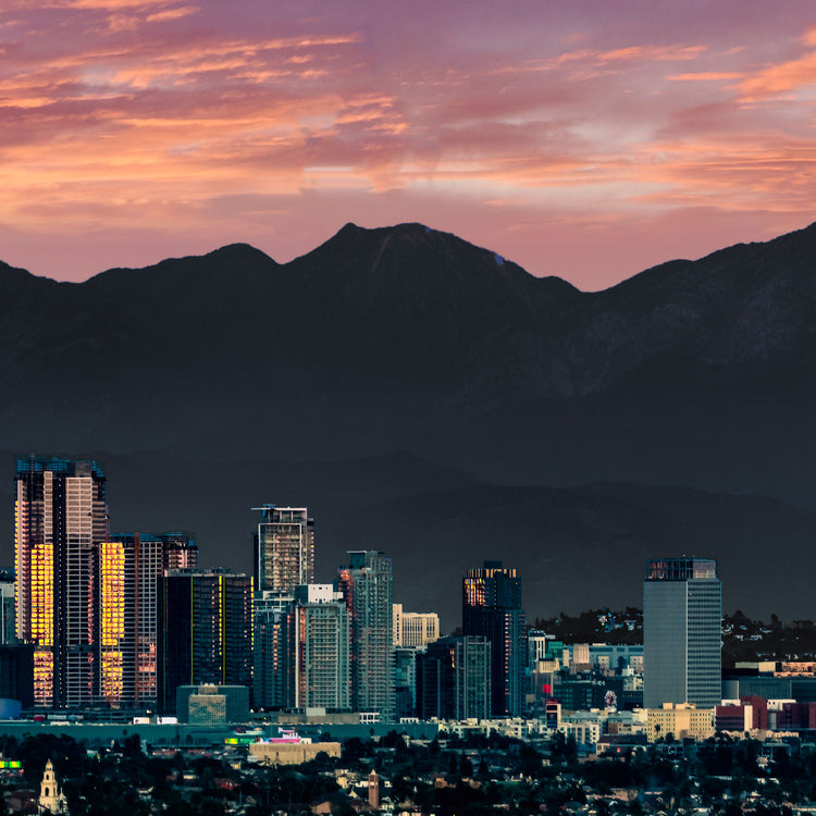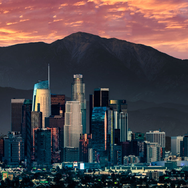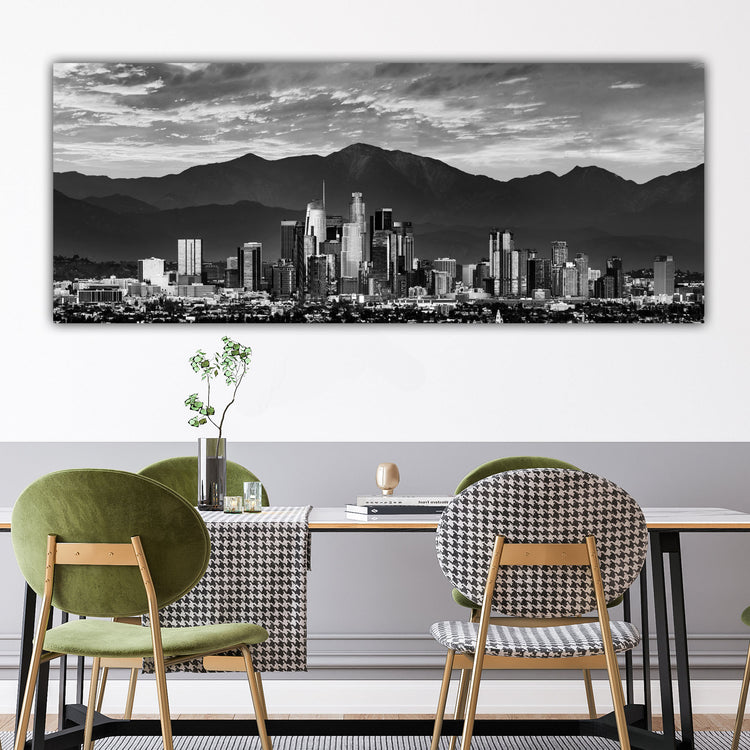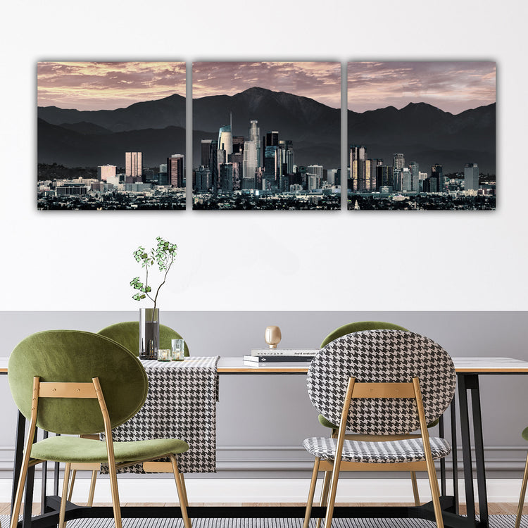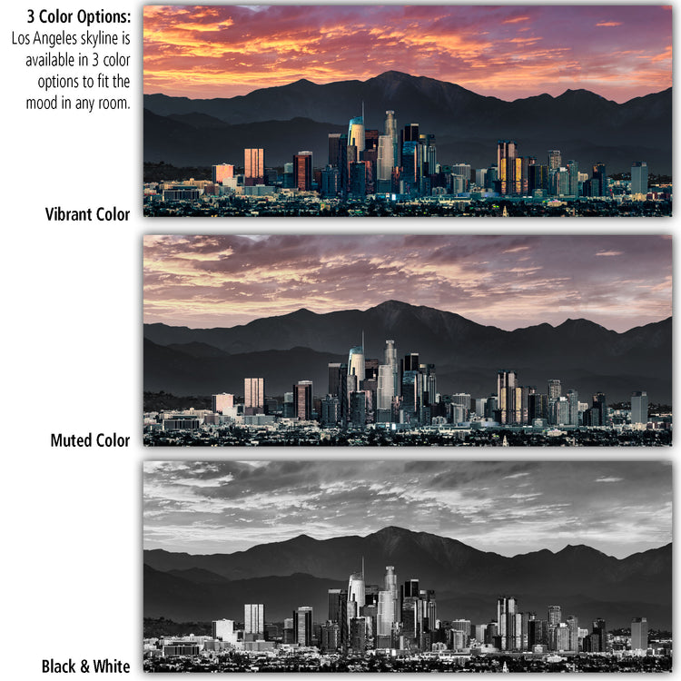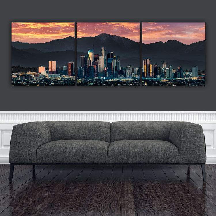 Dramatic sunset photo captures the energy of the Los Angeles skyline on this beautiful canvas with a dramatic backdrop of the San Gabriel Mountains. Available in single-panel and 3-panel options. A variety of sizes to fit any wall. Three great color options (vibrant color, muted color and black & white) to suit the mood in any room.