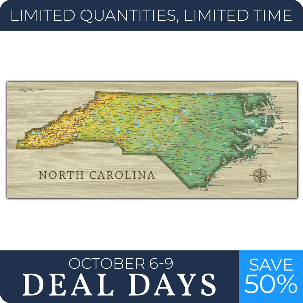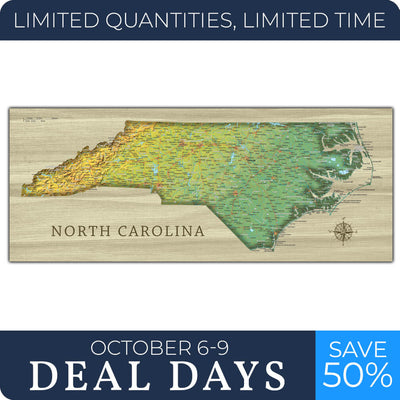 This listing is for limited quantities of our North Carolina Push Pin Terrain Map, and these limited quantities cannot be customized. See our customizable maps here.