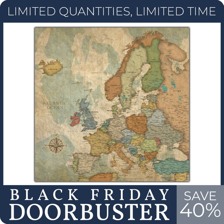 This Europe Push Pin Travel Map makes a beautiful statement on any home or office wall and also serves as a great way to record and plan all your travels. Rich, vintage earth-tones blend with most decors. Easy-to and ready-to hang; no additional framing necessary. Foam-like backing ensures pins stay intact. The perfect gift for any traveler.