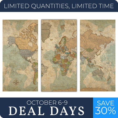 Push Pin World Travel Map with Current Countries, Gallery Wrapped, Framed Canvas. Three panel design gives a unique look without any information lost in separations. Vintage earth-tones blend with most decors. Easy-to and ready-to hang; no additional framing necessary. Foam-like backing ensures pins stay intact. The perfect gift for any traveler. Each map panel measures 24" x 48"