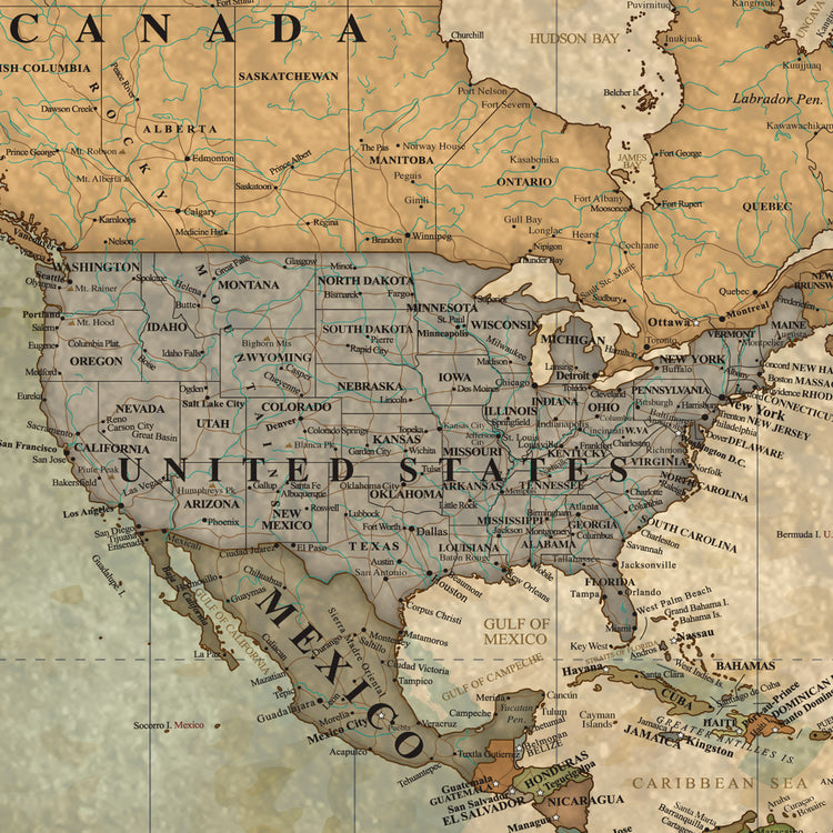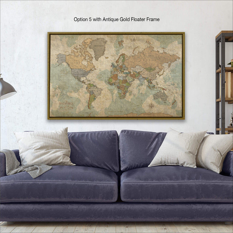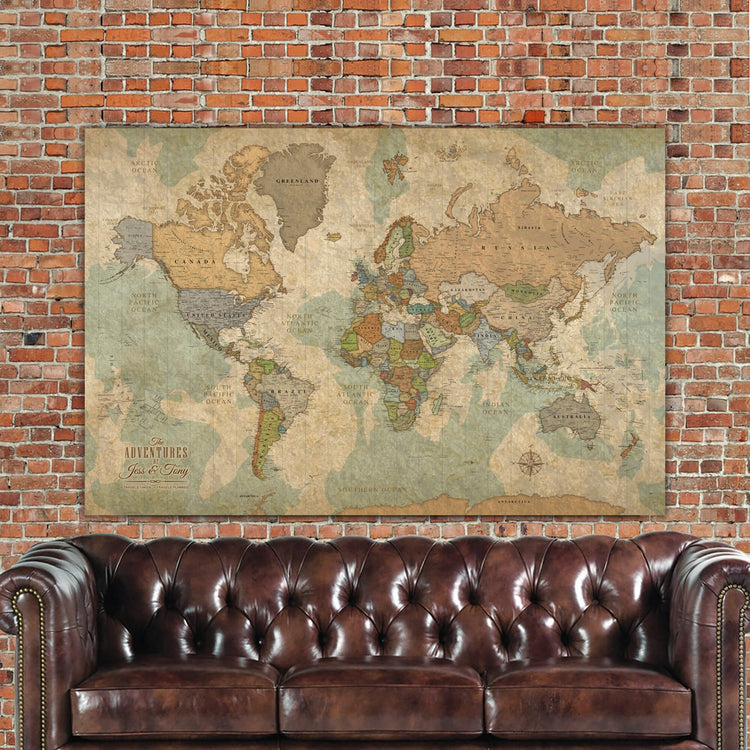 Push Pin World Travel Map with Current Countries as a SINGLE Panel. Gallery Wrapped Canvas makes a statement on any home or office wall as well as a great way to record and plan all your travels. Beautiful vintage earth-tones blend with most decors. Map features superb clarity with excellent city and country details. EASY to & READY to HANG - Choose from 3 formats, All feature our Premium Canvas.