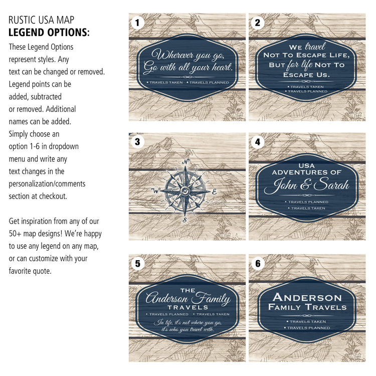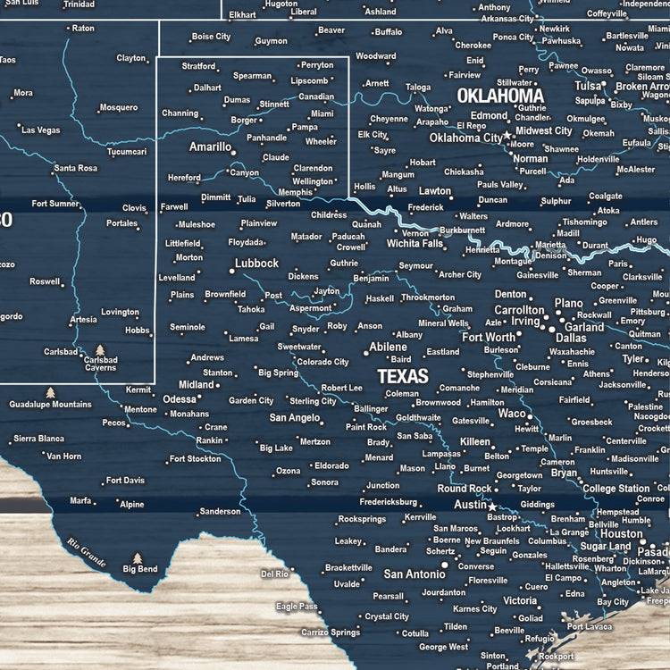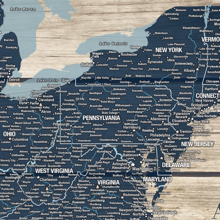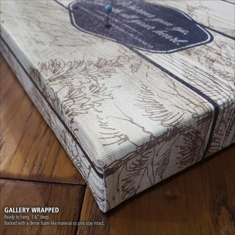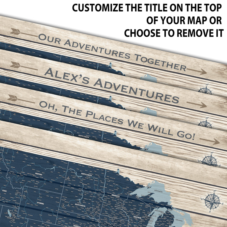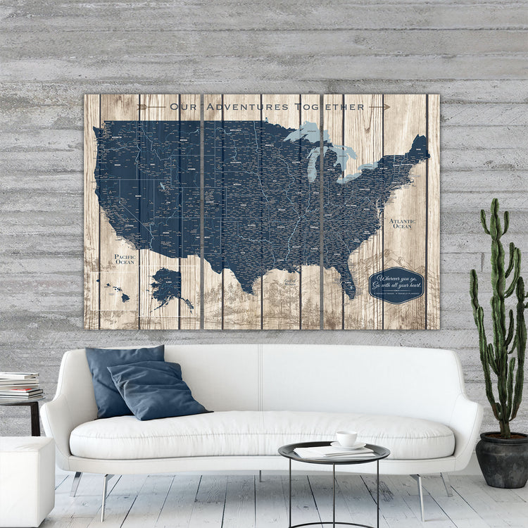 Our Large Rustic United States Push Pin Map makes a grand statement on your wall. Huge art--available in various sizes including nearly 8 foot wide and 4 foot tall! Makes a great conversational piece when guests come to visit and helps serve as motivation for your next trip. Map features a wood-grain background with optional landscape illustration & Navy State to add a little rustic farmhouse charm to your decor. Makes a great wedding, new home or travel gift and is customizable. Highly detailed cities and excellent clarity at any size. Ready to hang - no additional framing necessary. Superior foam-like backing under our special, blended canvas ensures your push pins will stay intact. Map includes National Parks.