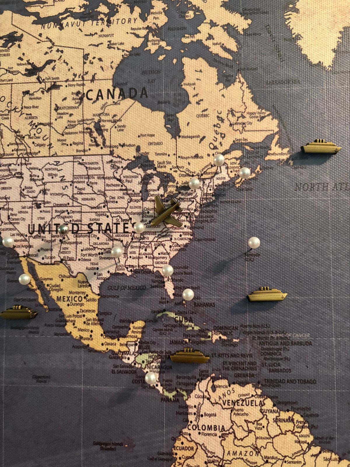 Highly customized, highly detailed Push Pin World Travel Map with white on Slate Blue Background. Map features current, up-to-date countries. Great clarity with excellent city and country details, map is READY to HANG. No additional framing necessary. Foam-like backing under our special, blended canvas ensures your pins will stick and stay intact.