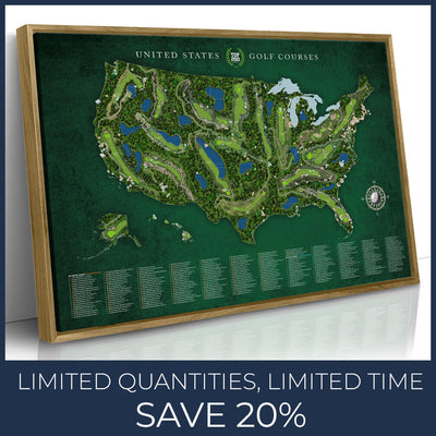 Our Golf Course Map features the Top 250 Golf Courses in the USA. The perfect gift for any golfer. The location of each course is plotted on the map which also showcases 18 of the top golf holes in America as the backdrop. Use to track golf courses played with white golf ball-like push pins, or this meticulously crafted illustration can simply be used as beautiful wall art in a home or office. Easy-to and ready-to hang; includes brown Floater Frame. Foam-like backing ensures pins stay intact. The perfect gift for any traveler. Map measures approximately 25.5" x 21.5" including Floater Frame.