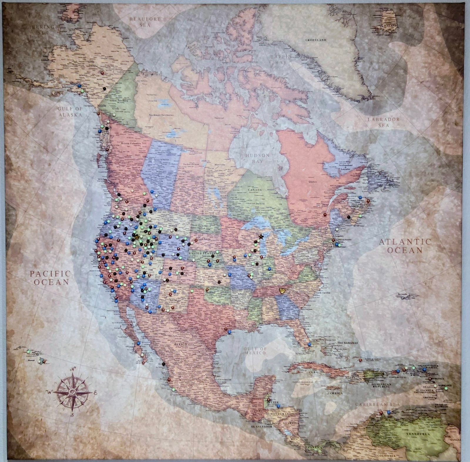 We absolutely love our new map. It is so fun to really see how much travel we have done in the West in particular. The map colors are also perfect for our home decor.