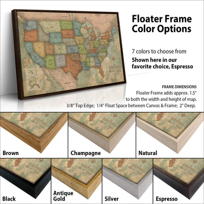 USA Push Pin Travel Map in vintage, earthy colors makes for a great way to record and plan your travels and have nice, large art to fill your walls. Framed with Gallery-Wrapped canvas, makes a great conversational piece when guests come to visit, or give as a wedding, new home or travel gift. This customizable map features superb clarity with excellent details at any size. Ready to hang - no additional framing necessary. Superior foam-like backing under our special, blended canvas ensures your push pins will stay intact. Map includes National Parks.